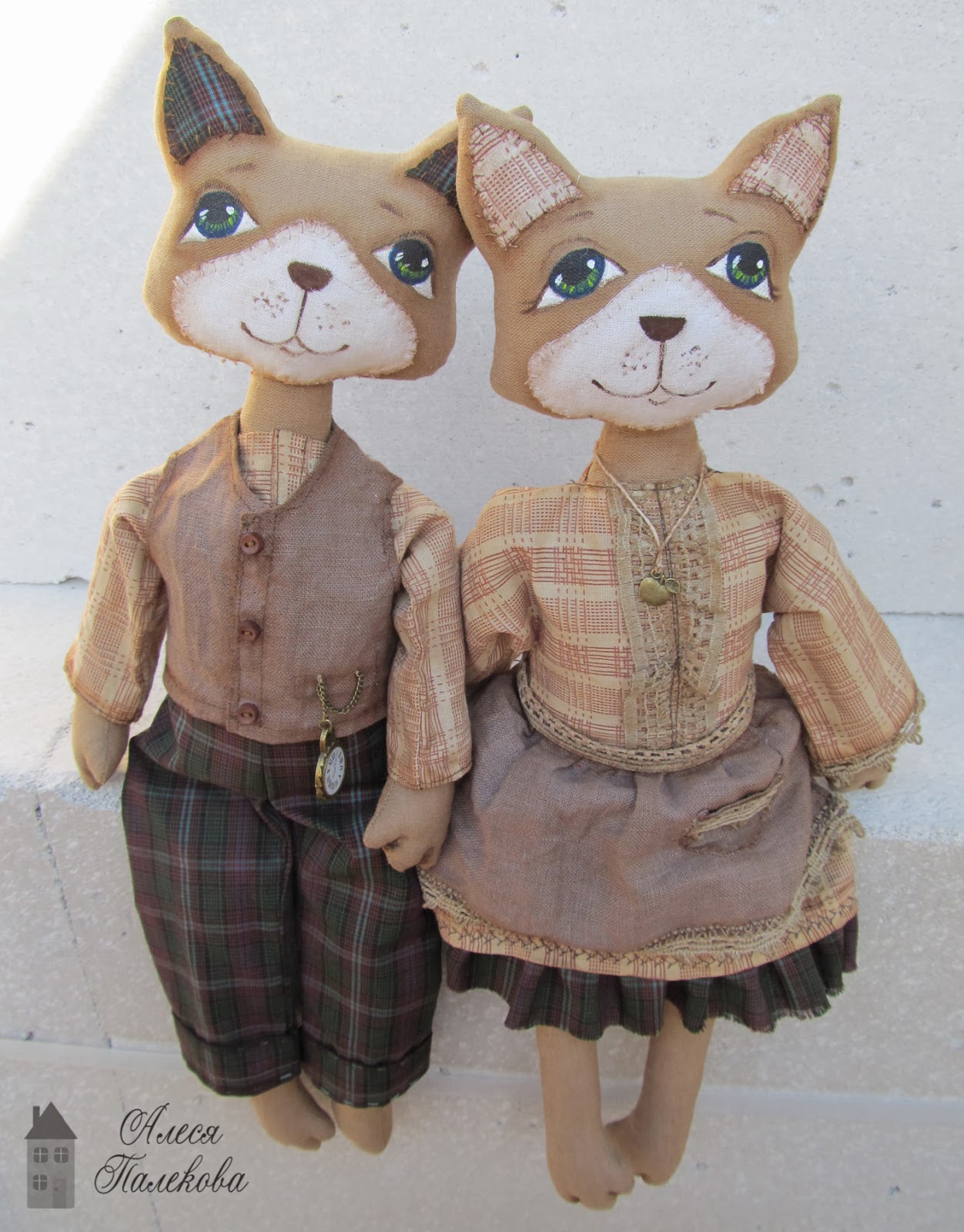 Рост 40 см. Сшиты из льна и хлопка. Кружево, акриловые краски, фурнитура под бронзу. Усы тоже есть, присмотритесь. И хвосты на месте)) Фоток много, потому как товарищей тоже много))